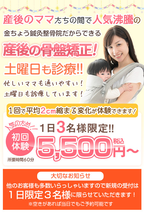 金ちょう鍼灸整骨院の骨盤矯正は尿漏れを防ぐ筋肉をつけることができる施術です。産後の尿漏れにお悩みの方は、ひとりで悩まずに金ちょう鍼灸整骨院にご相談ください。